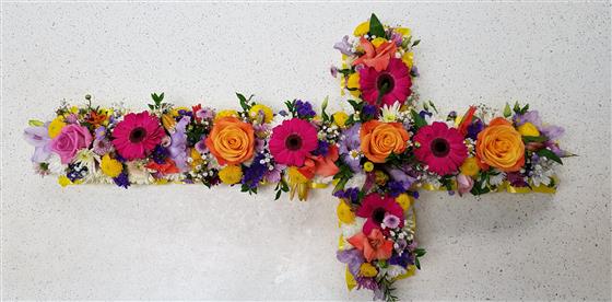A mixture of seasonal flowers and colours on a 34" cross