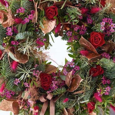 A touch lovelier than our standard wreath, this one will feature more blooms, or more luxurious blooms (or both!) in a fresh modern style. It'll feature gorgeous fresh blooms and foliage. Expect cerise and purple tones, plus blooms in soft pink, peach or lilac shades. It might also feature dried flowers or foliage painted in copper or rose gold.