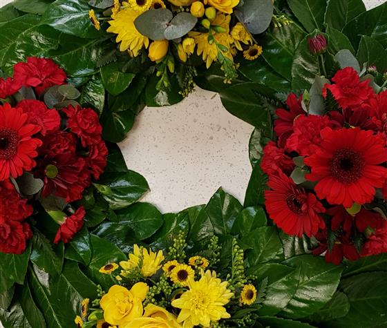 16" Wreath covered in Laurel with 4 sprays of yellow and red.