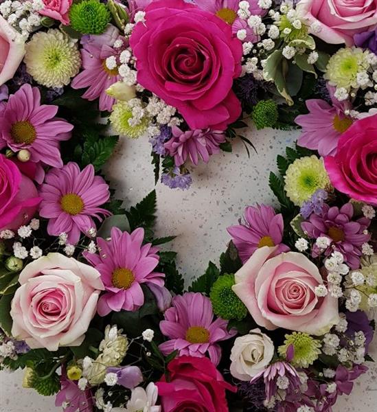 A selection of pink flowers including roses carnations and gypsophlia on a open heart.