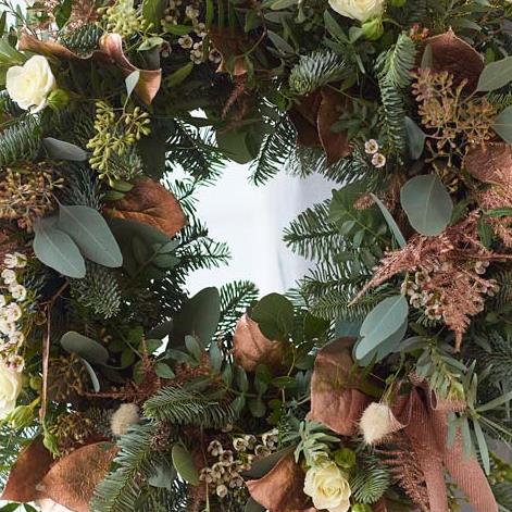 A gorgeous wintery wreath, handcrafted by a local florist using flowers and foliage in muted tones.